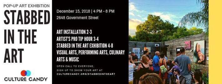 - February 4-27, 2019, Stabbed in the Art Month-Long Exhibition, Stabbed in the Heart, Reception 2/15, Arts Council of Greater Baton Rouge